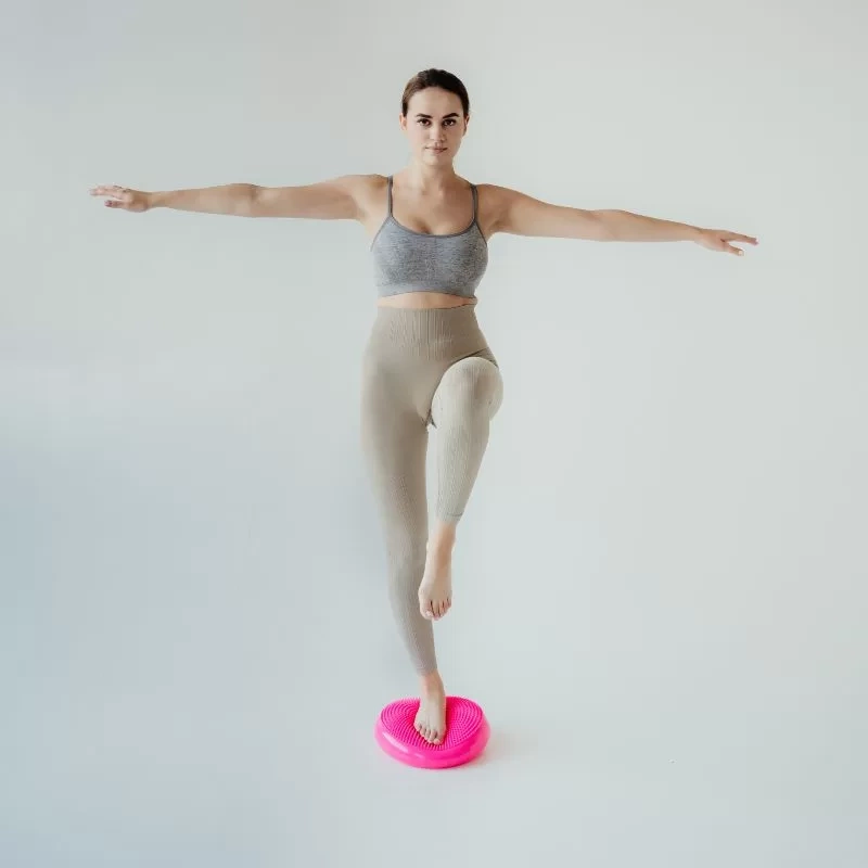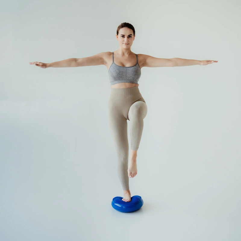Druhým využitím je stát na polštářku na jedné noze. Snažte se udržet rovnováhu. Jakmile toto zvládnete, švihněte volnou nohou mírně dopředu, dozadu a do strany. Tento cvik posílí stabilizaci hlezenních a kolenních kloubů.