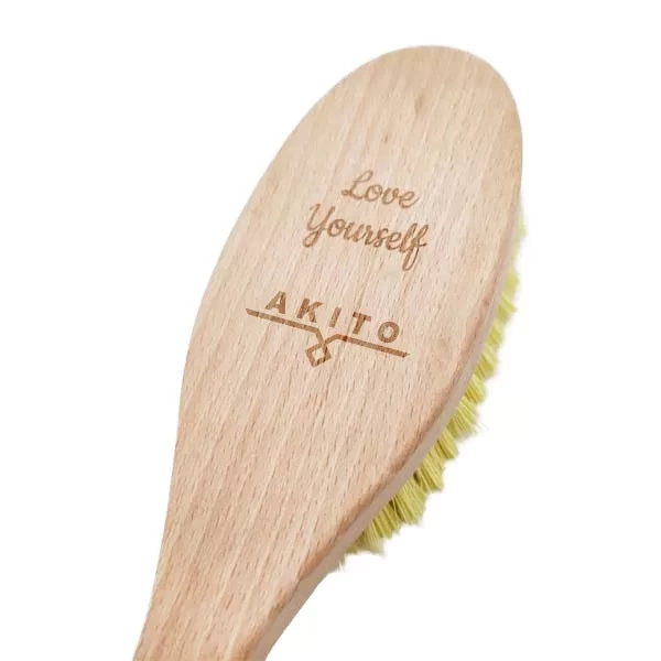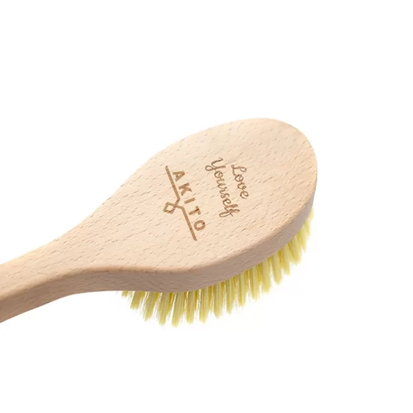Kartáč na koupání a masáž těla s dlouhou dřevěnou rukojetí. Měkké nylonové štětiny účinně čistí pokožku a zanechávají ji hladkou, pevnou a pružnější. Nedráždí pokožku, ale působí zklidňujícím a relaxačním účinkem, odlupuje odumřelou kůži a zlepšuje prokrvení pokožky. Odstraňuje únavu a při večerním použití zajistí kvalitnější spánek. Dlouhá dřevěná rukojeť umožňuje snadné a pohodlné použití kartáče na celé tělo jak ve sprše, tak při koupání ve vaně. Dá se s úspěchem používat s koupelovou kosmetikou. Na hřídeli kartáčku je nápis "Love Yourself" a logo značky Akito.